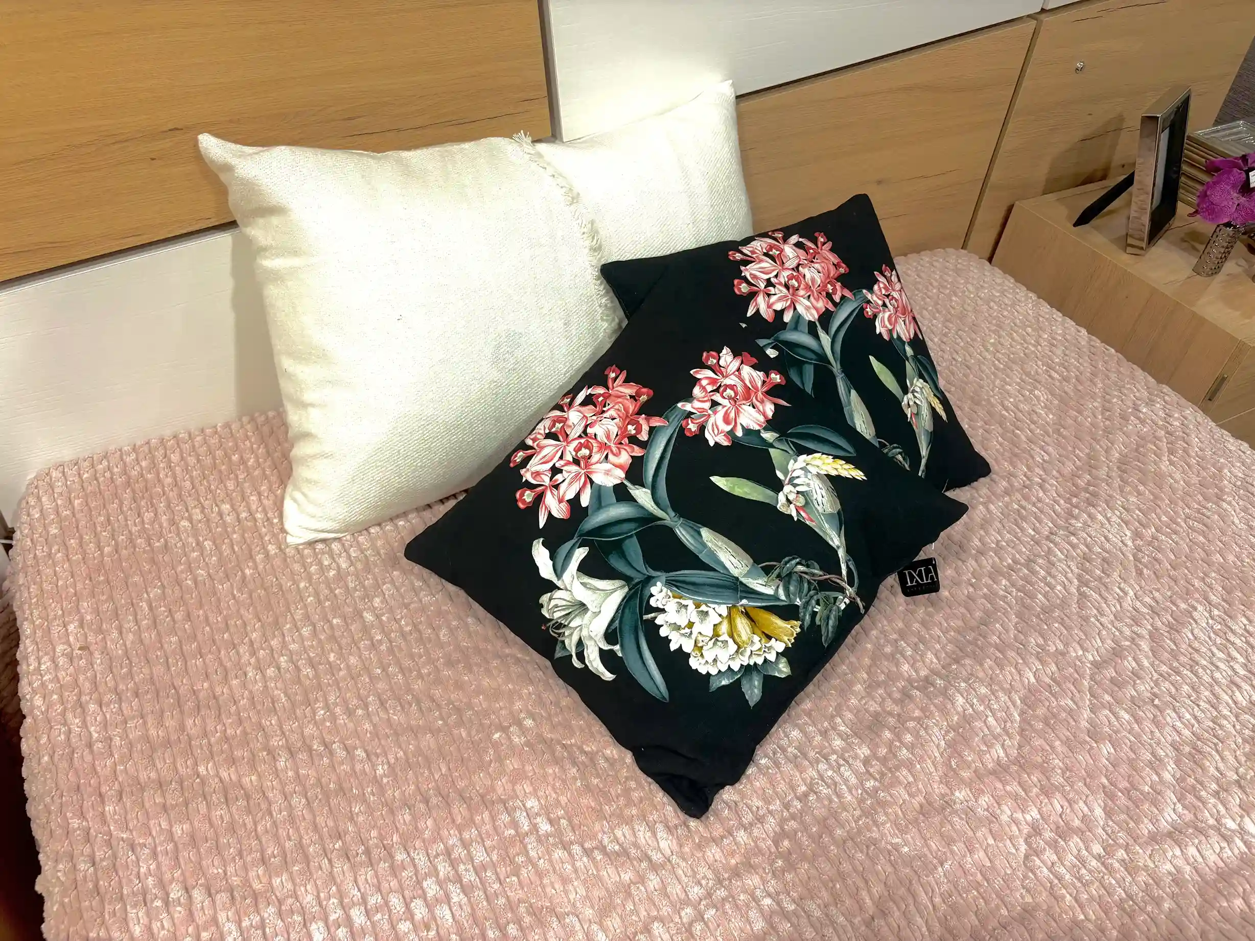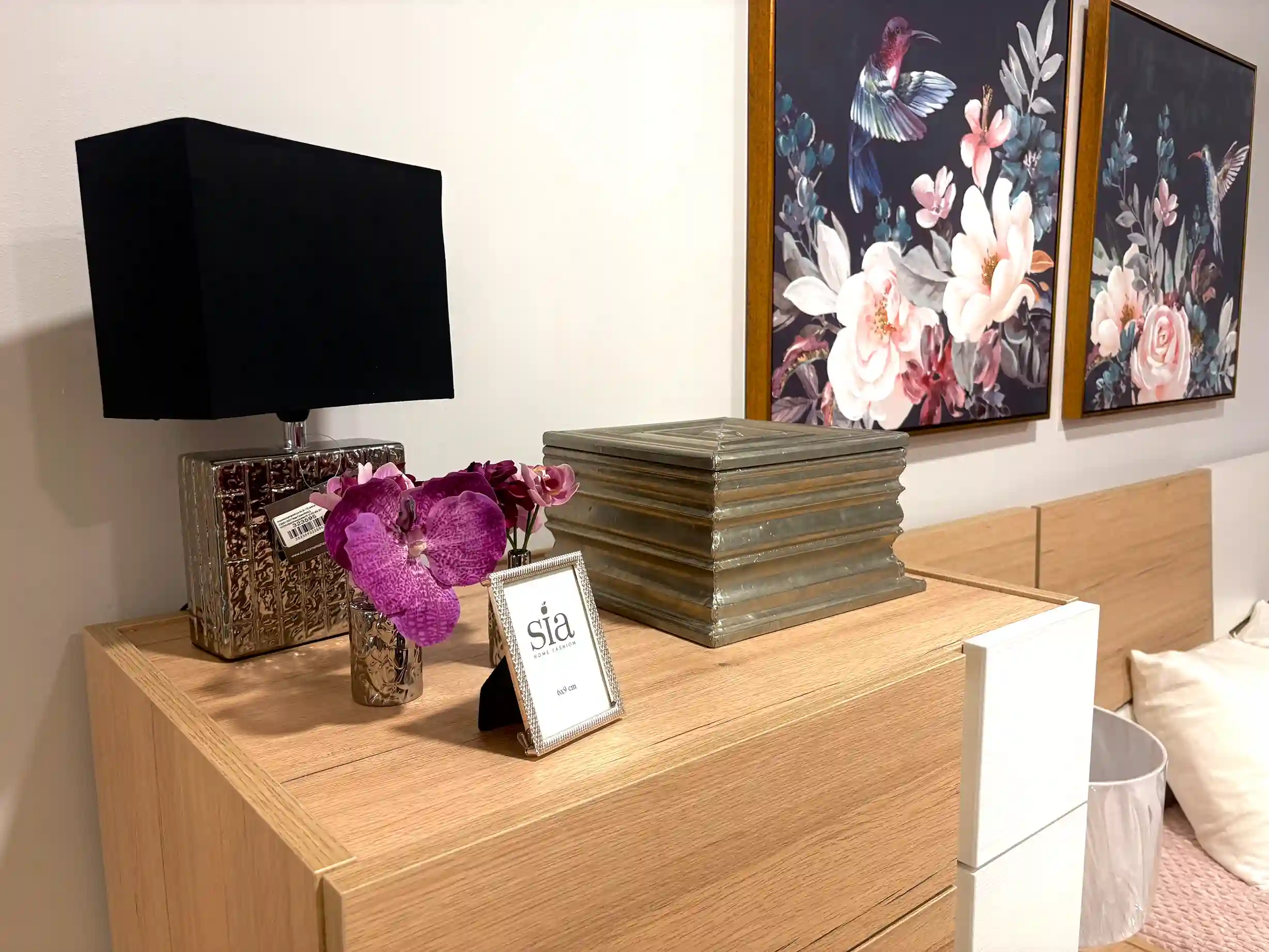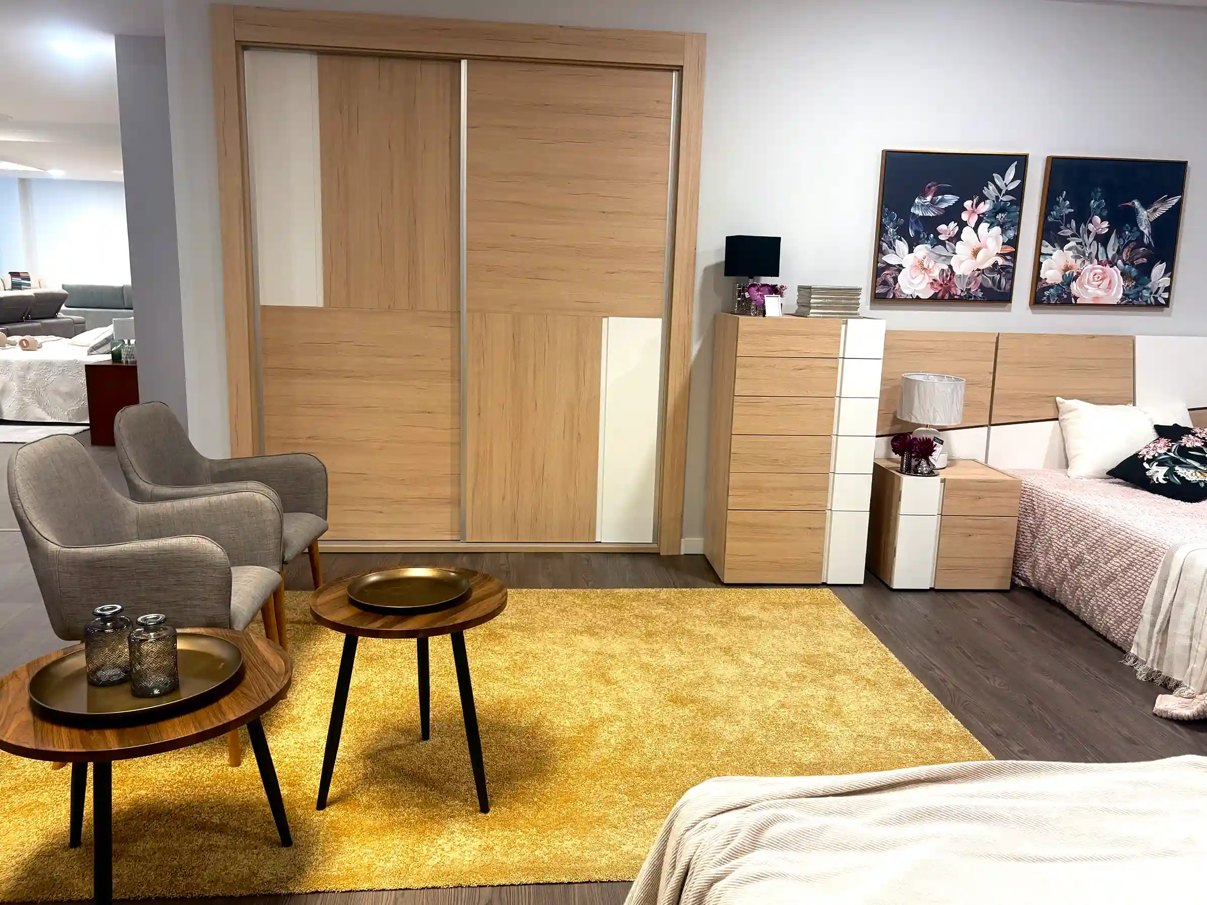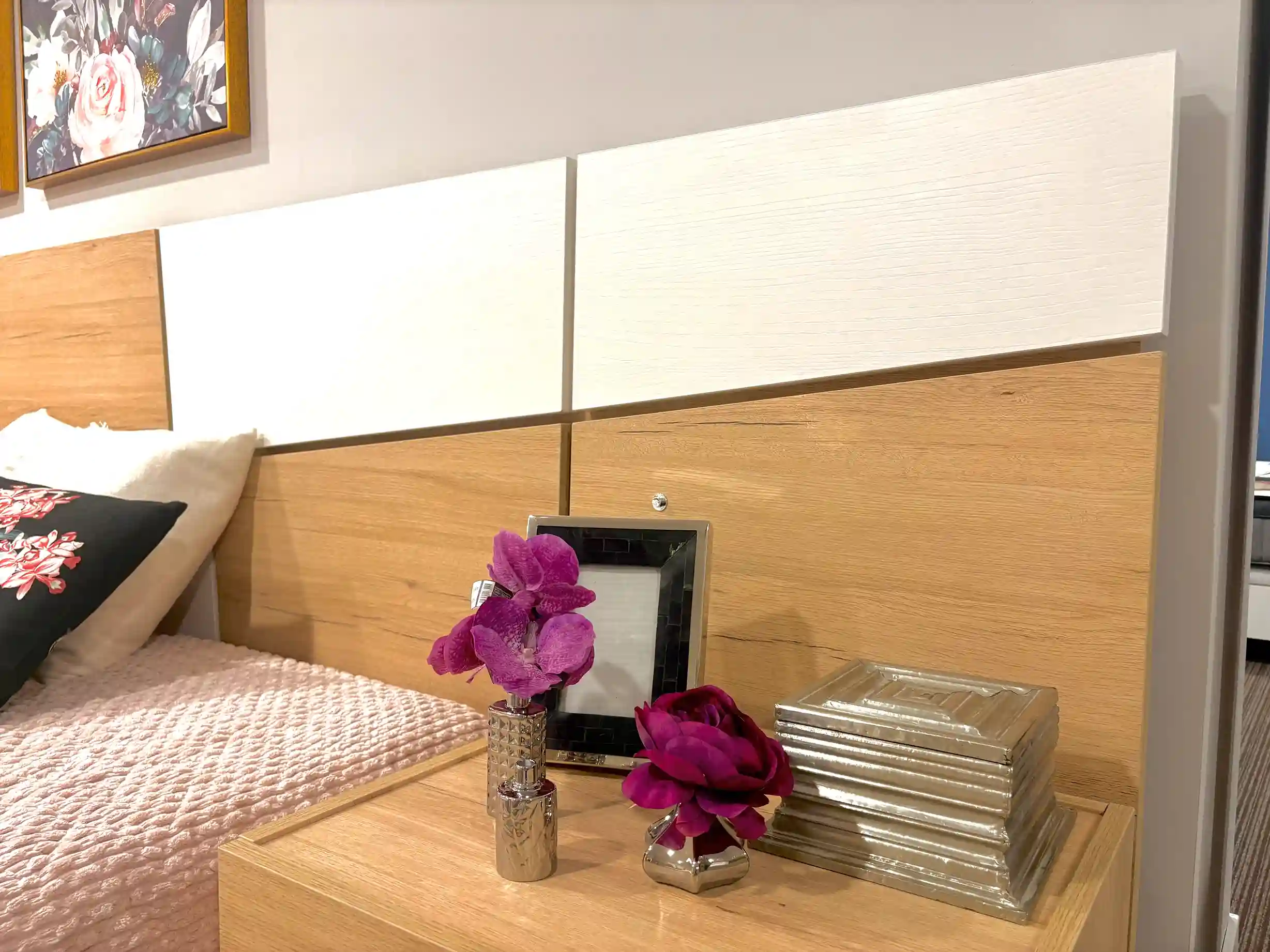 Este dormitorio destaca por su diseño geométrico y contemporáneo, donde la combinación de roble natural y blanco aporta equilibrio, luminosidad y carácter. El cabecero segmentado crea un efecto visual único que se integra a la perfección con las mesitas y la cómoda, todas ellas diseñadas con líneas limpias y frentes combinados. Los cuadros florales aportan un toque romántico y sofisticado, suavizando la composición con colores delicados. La ropa de cama en tonos rosados y los detalles decorativos en flores y cristal completan un ambiente cálido, moderno y lleno de personalidad. Un dormitorio pensado para quienes buscan diseño actual sin renunciar a la serenidad y el confort.
