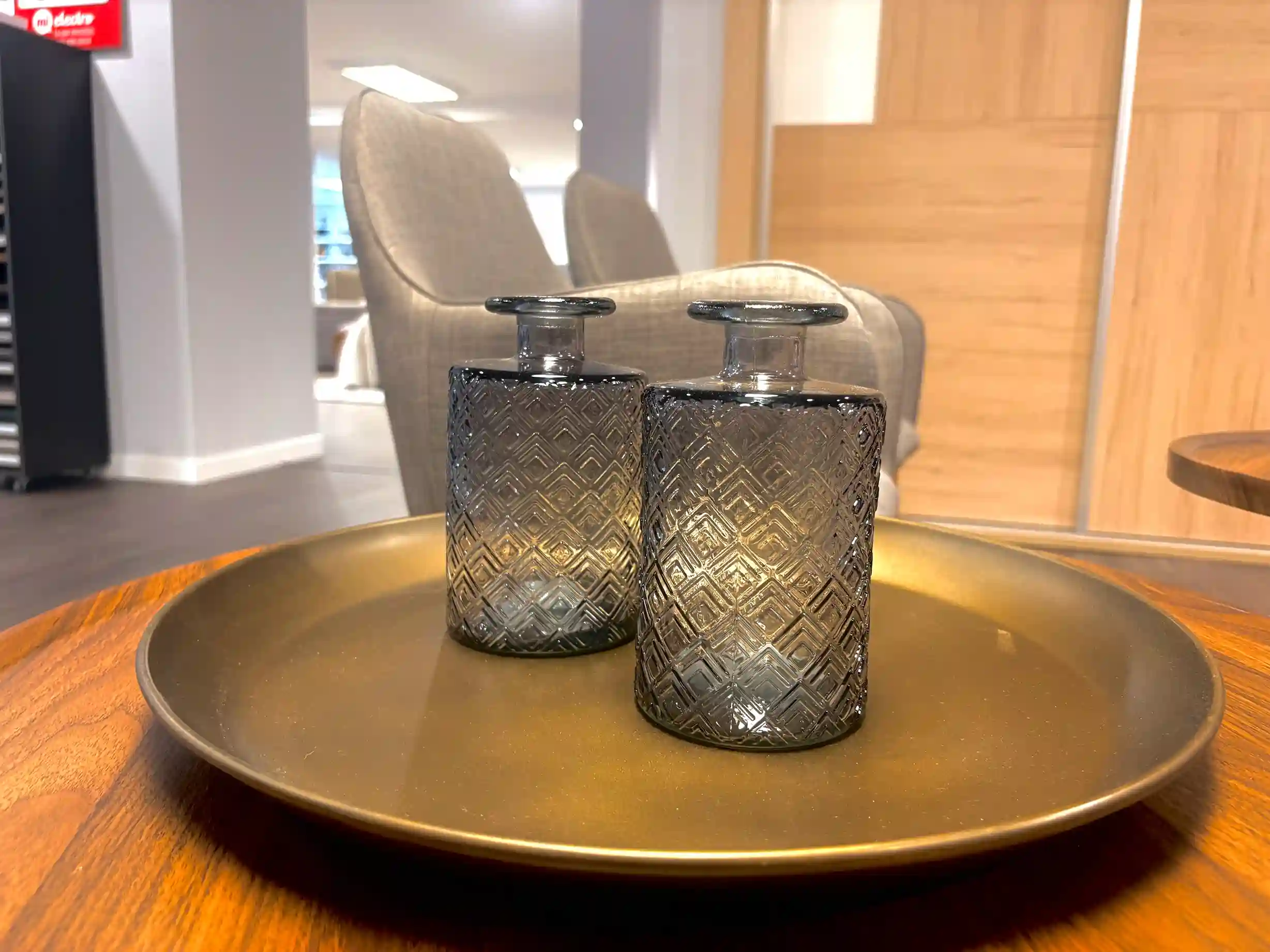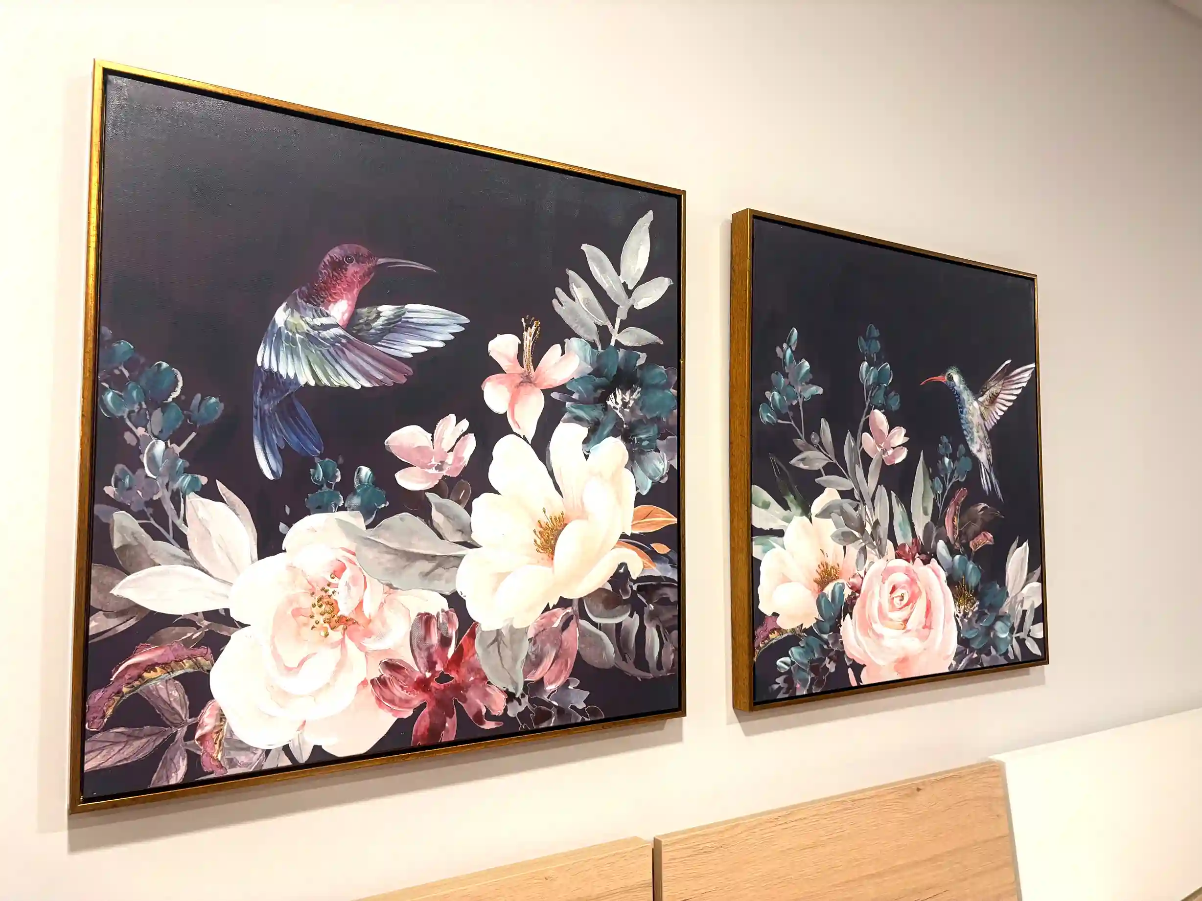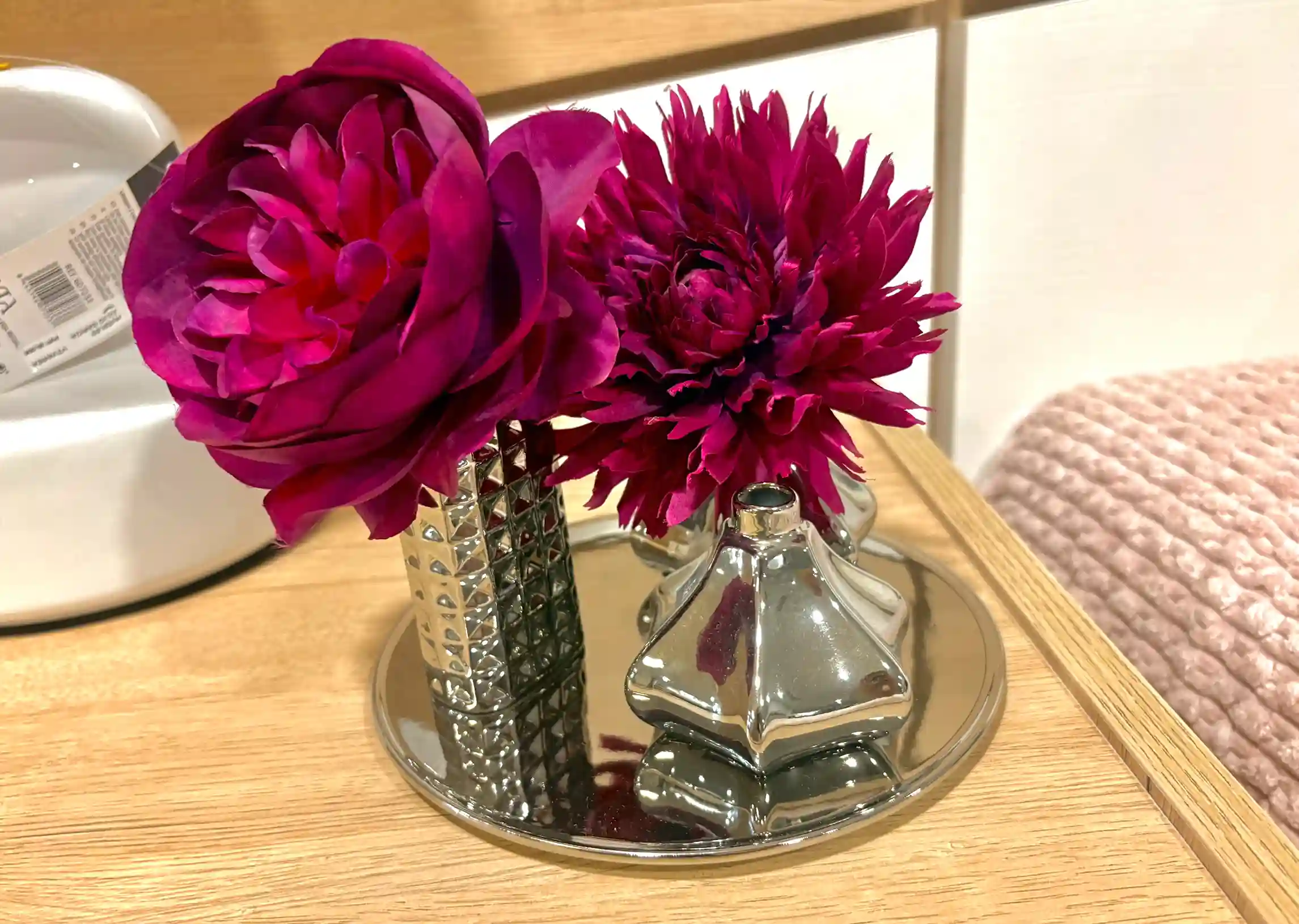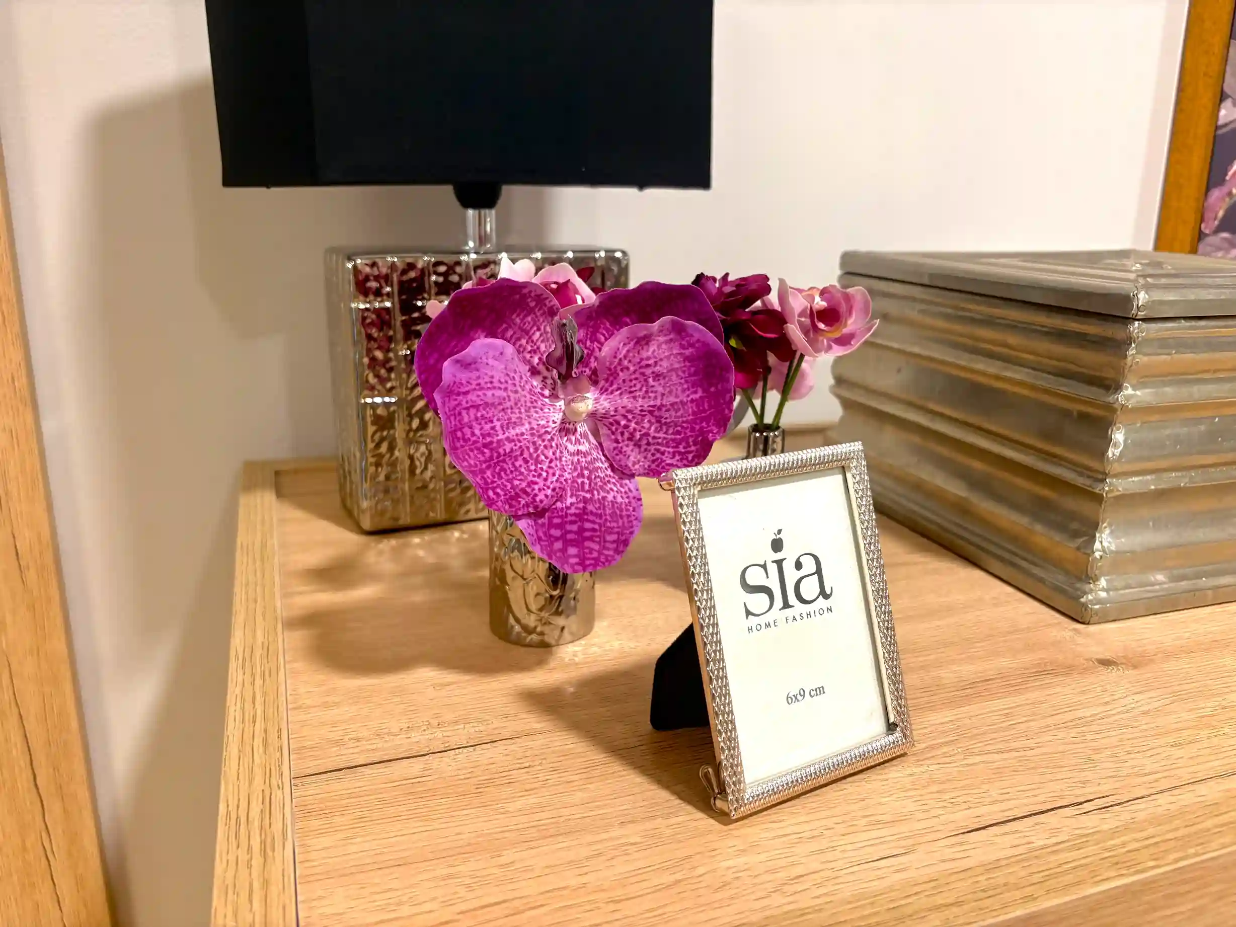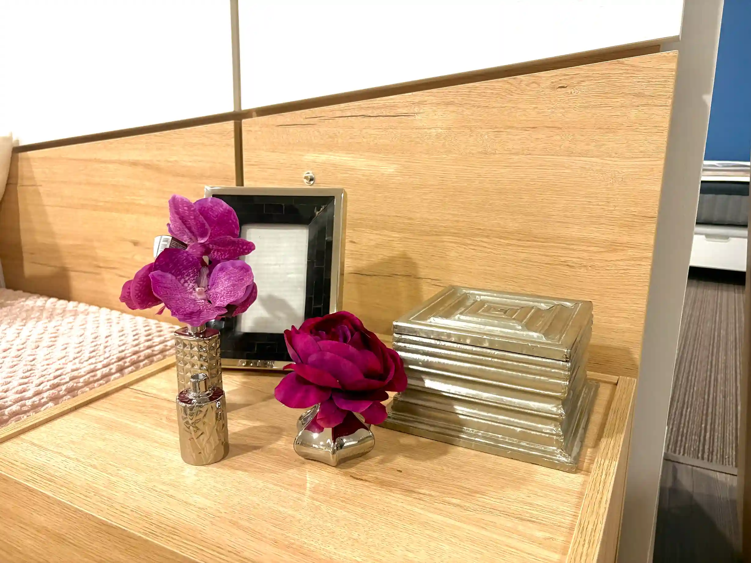 Este dormitorio destaca por su diseño geométrico y contemporáneo, donde la combinación de roble natural y blanco aporta equilibrio, luminosidad y carácter. El cabecero segmentado crea un efecto visual único que se integra a la perfección con las mesitas y la cómoda, todas ellas diseñadas con líneas limpias y frentes combinados. Los cuadros florales aportan un toque romántico y sofisticado, suavizando la composición con colores delicados. La ropa de cama en tonos rosados y los detalles decorativos en flores y cristal completan un ambiente cálido, moderno y lleno de personalidad. Un dormitorio pensado para quienes buscan diseño actual sin renunciar a la serenidad y el confort.