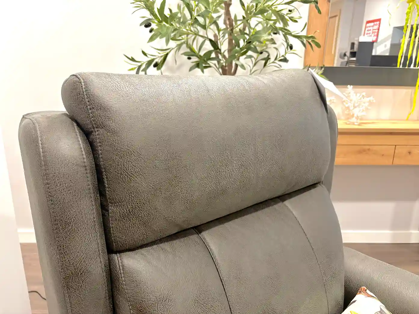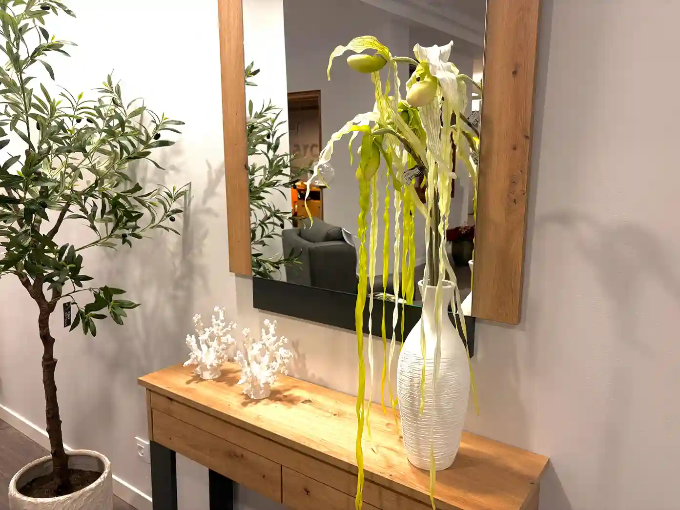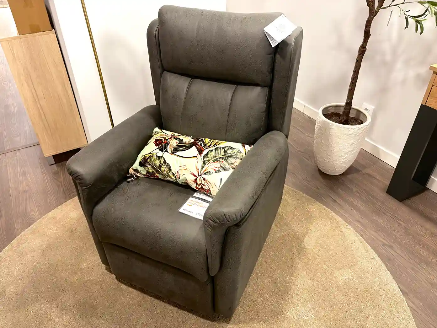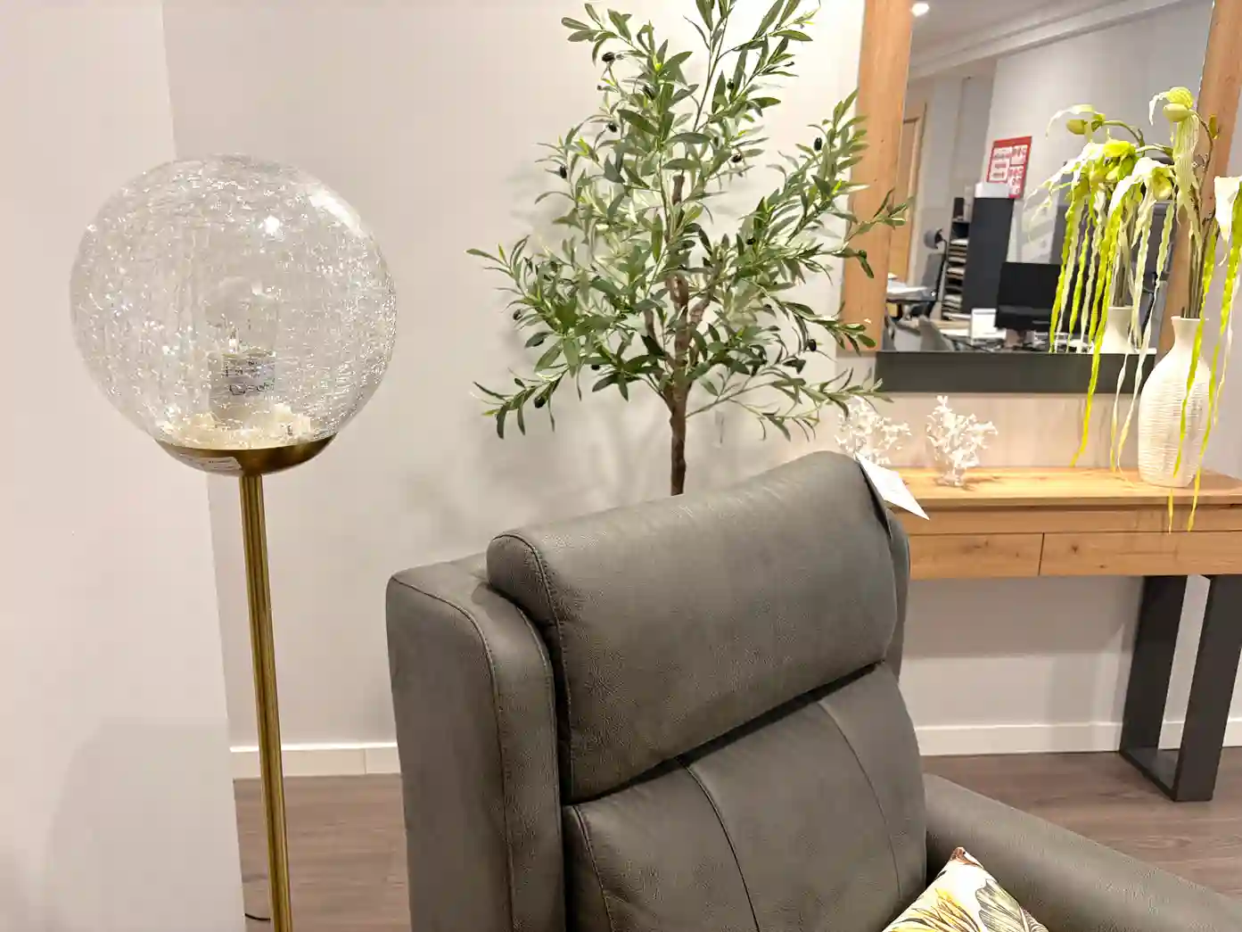 Este acogedor rincón combina comodidad y diseño contemporáneo en perfecta armonía. El sillón relax, tapizado en un tono gris cálido, invita al descanso mientras que la lámpara de pie con esfera de cristal aporta un toque sofisticado y suave iluminación ambiental. La consola en madera natural con patas en acabado grafito, acompañada de un espejo a juego, crea un espacio equilibrado y lleno de personalidad. La planta decorativa y los detalles florales añaden frescura y un aire natural al conjunto. Un ambiente pensado para disfrutar de momentos de calma con estilo y confort.