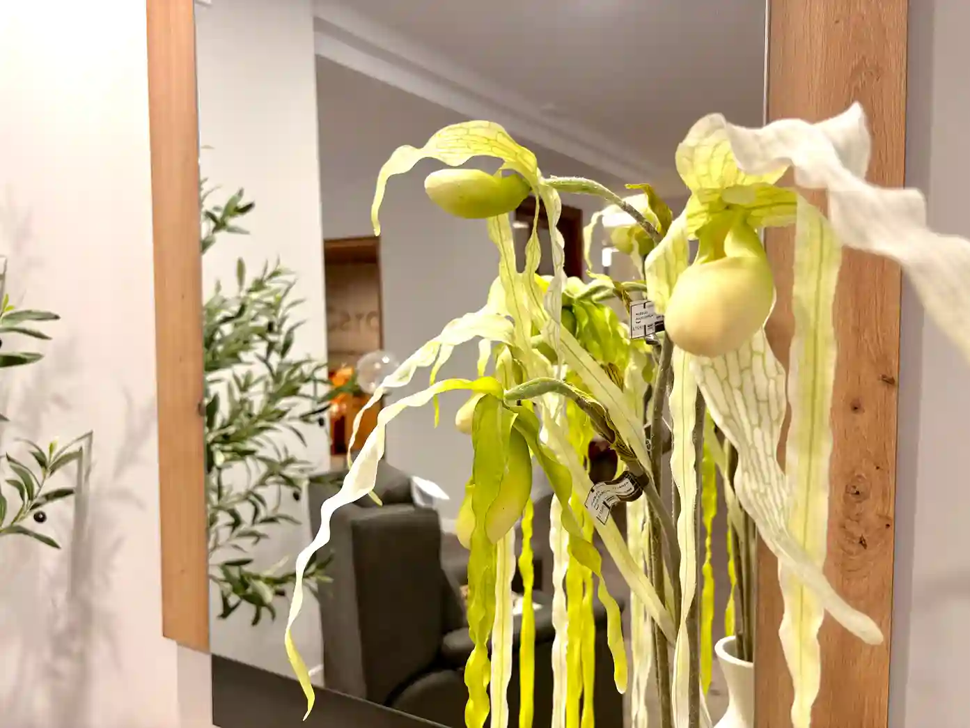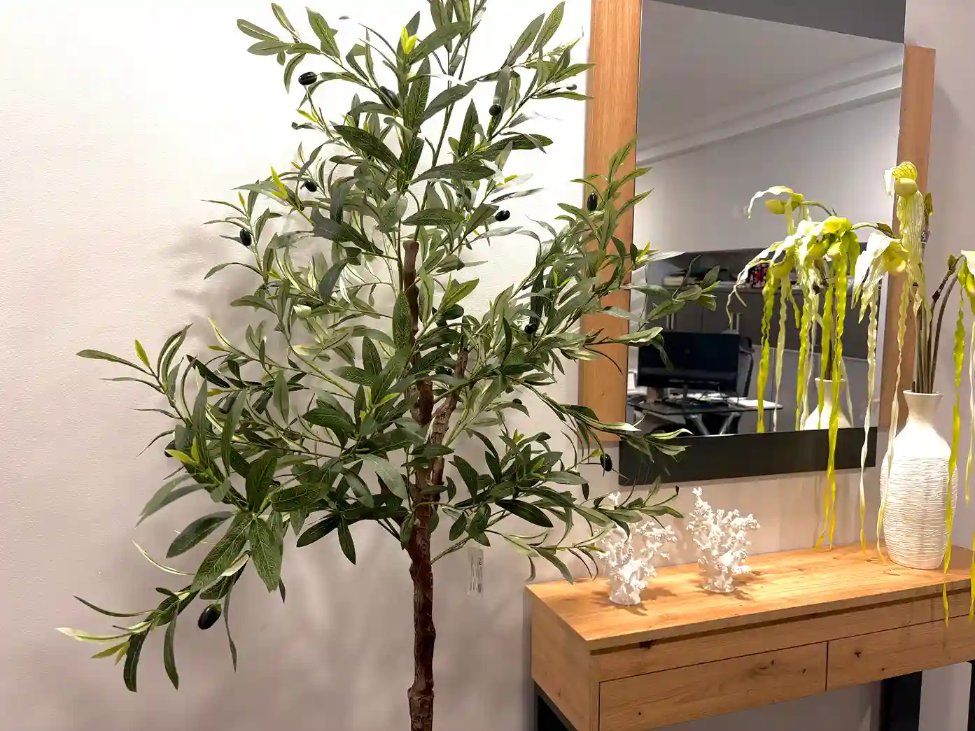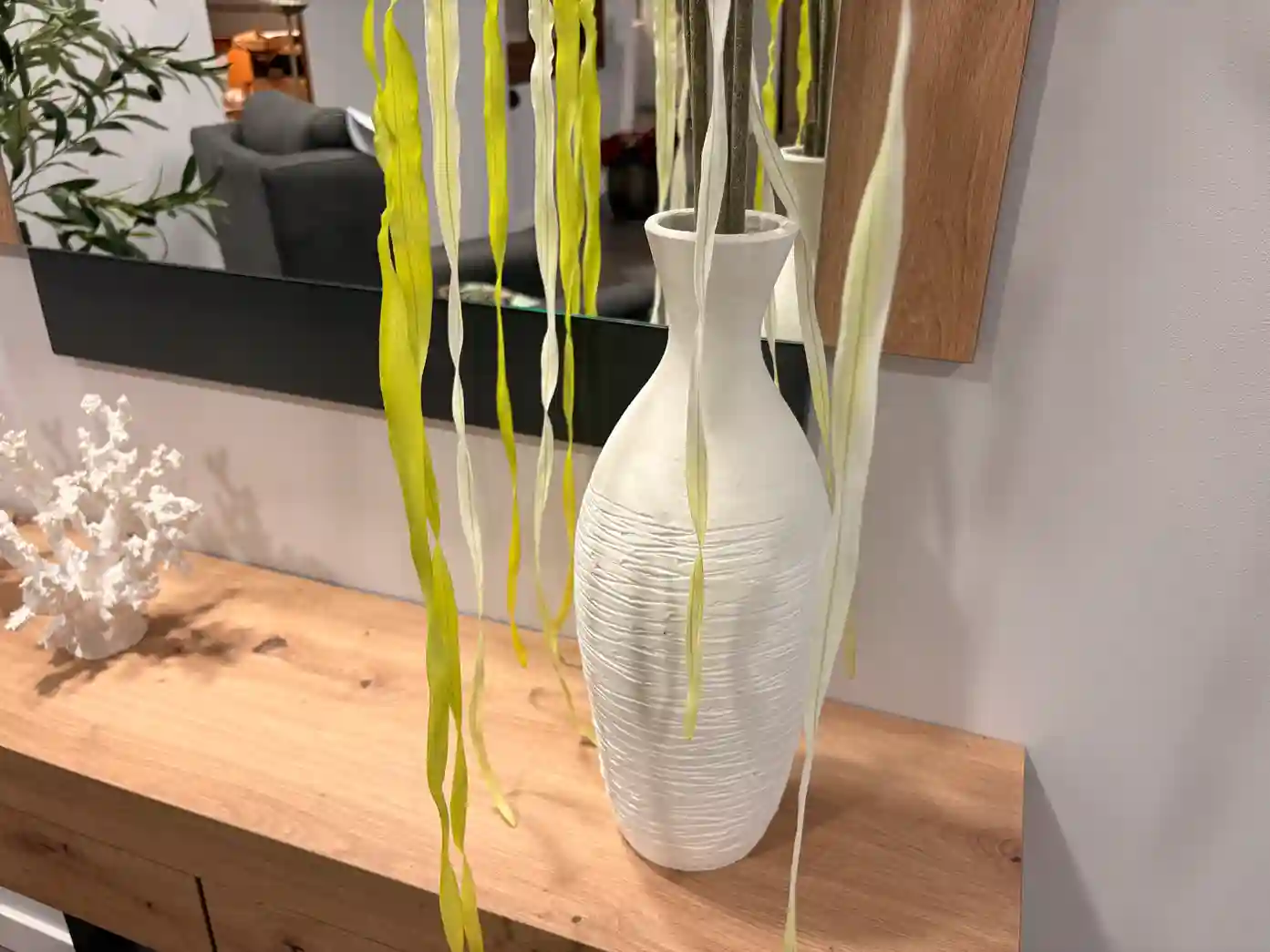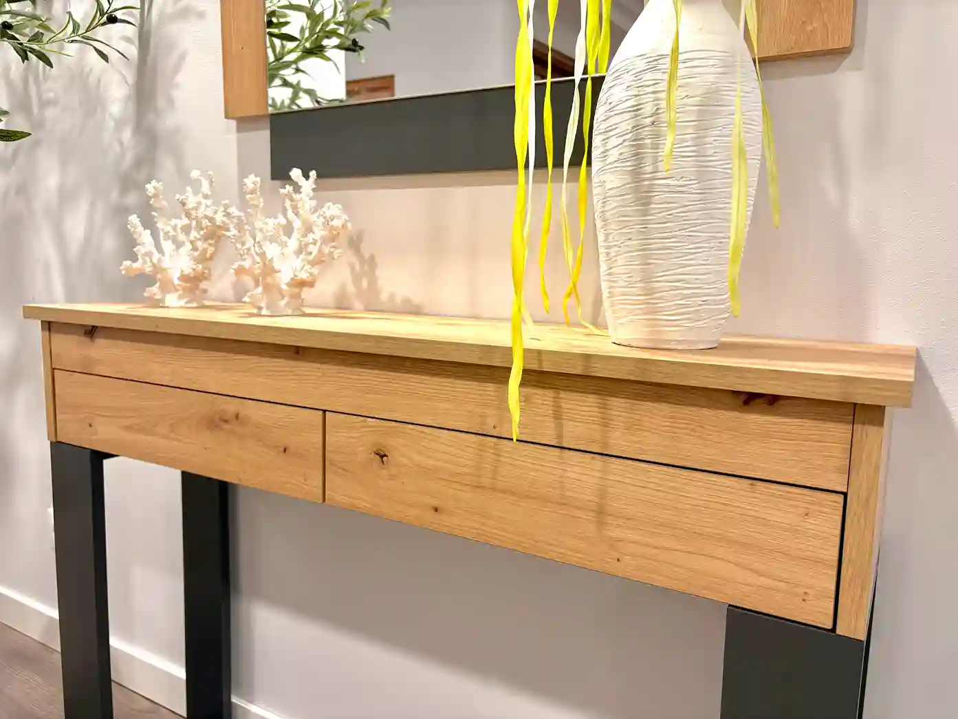 Este acogedor rincón combina comodidad y diseño contemporáneo en perfecta armonía. El sillón relax, tapizado en un tono gris cálido, invita al descanso mientras que la lámpara de pie con esfera de cristal aporta un toque sofisticado y suave iluminación ambiental. La consola en madera natural con patas en acabado grafito, acompañada de un espejo a juego, crea un espacio equilibrado y lleno de personalidad. La planta decorativa y los detalles florales añaden frescura y un aire natural al conjunto. Un ambiente pensado para disfrutar de momentos de calma con estilo y confort.